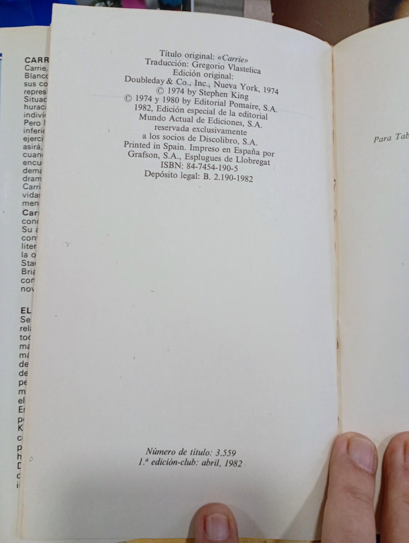 Esta edición especial de Carrie, publicada en abril de 1982 por Editorial Pomaire, forma parte de la colección Mundo Actual de Ediciones y fue distribuida exclusivamente a los socios del Club Discolibro. Traducida por Gregorio Vlastelica, conserva el espíritu original de la novela que lanzó a Stephen King al estrellato literario.