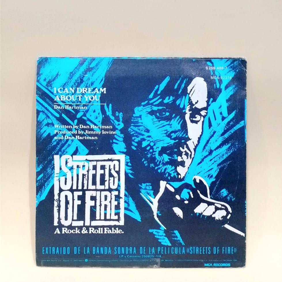 Disco de vinilo single de la banda sonora original de la película “Streets of Fire”, “Calles de fuego”. Incluye el temazo “I can dream about you” de Dan Hartman, y en su cara B, “Blue Shadows” de The Blasters. Un precioso obsequio con un diseño de carátula único.